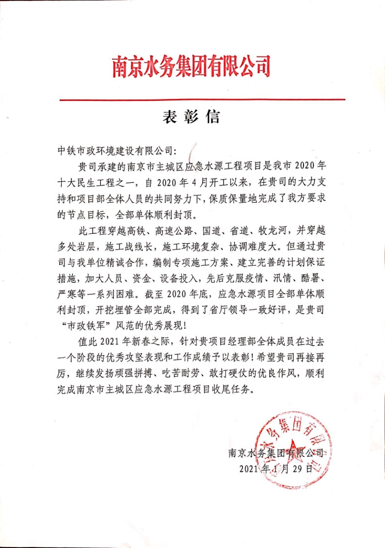 1月29日,中國中鐵股份有限公司印發(fā)《中國中鐵關(guān)于表彰2020年度綠色施工科技示范工程的決定》文件,公司承建的淮安區(qū)黑臭水體綜合整治PPP項(xiàng)目、南京浦口水廠改擴(kuò)建及深度處理工程榜上有名,榮獲“中國中鐵2020年度綠色施工科技示范工程”稱號(hào)。...